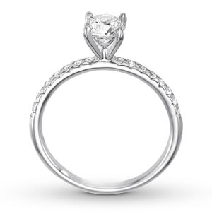 This timeless engagement ring is graced with a sparkling 5/8-carat round diamond center. More diamonds glisten along the band to complement, bringing the total diamond weight to 3/4 carat. The ring is fashioned in 14K white gold.