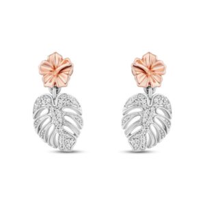 Featuring a tropical design, these earrings feature 10K rose gold hibiscus flowers shimmering on the posts while glittering round diamonds sparkle on the dangling leaves. The earrings have a total diamond weight of 1/10 carat and are secured with a friction back.